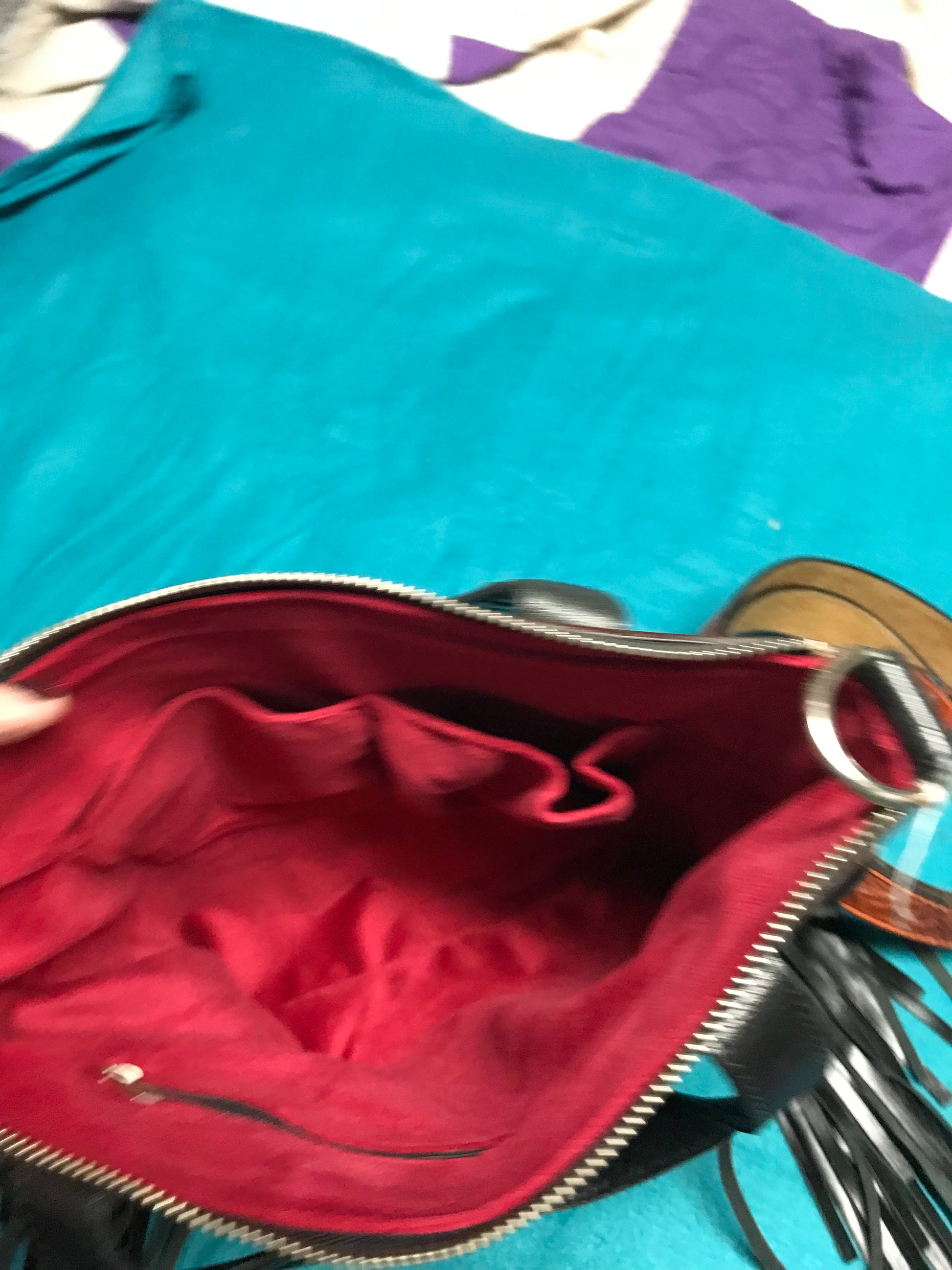 Black and white hair on hid purse with brown trim. With painted cow skull on both sides. Comes with a beautiful tooled leather strap to wear as a crossbody purse.